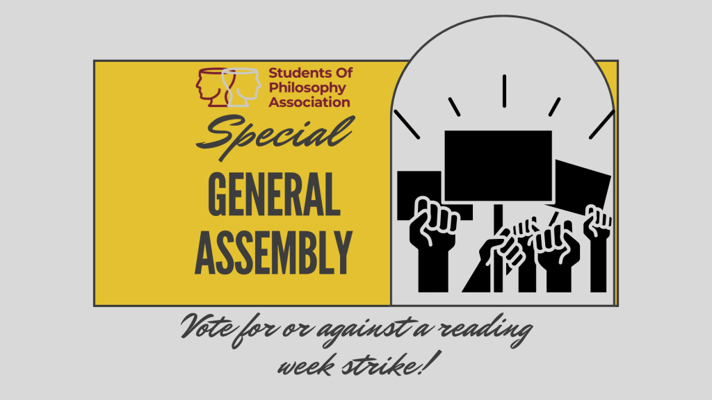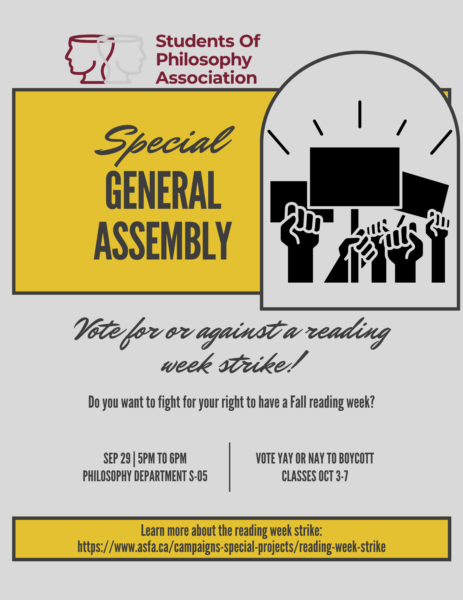 We’re holding a Special General Assembly—a place for philosophy students to gather to take part in democracy to vote for or against our official participation in this strike. Come join us on September 29th at 5pm to discuss and vote for or against boycotting classes during the first week of October.