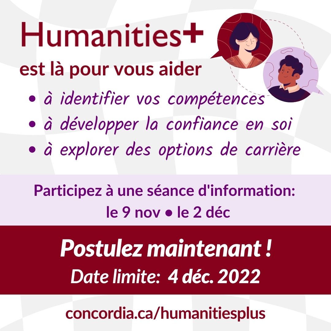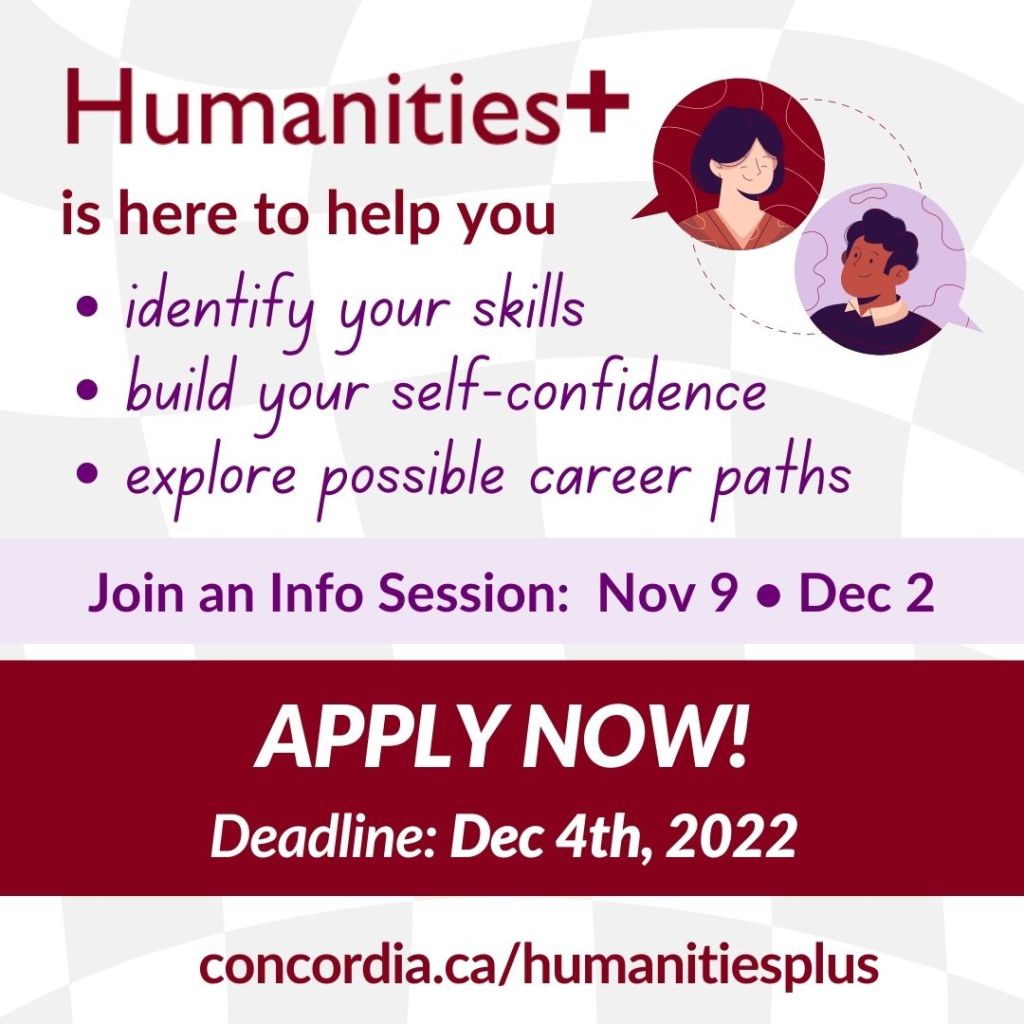 Please see our website for details, and don’t hesitate to email humanitiesplus@concordia.ca if you have any questions!