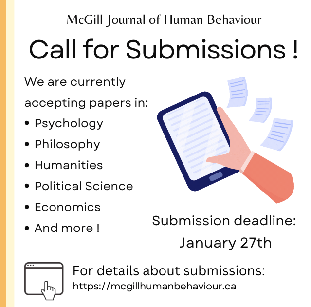 Have you written an essay in philosophy, politics, economics, psychology, sociology, history or a related field? We want to see your work! MJHB seeks to publish perspectives from a variety of fields, and to explore their common questions. We encourage submissions from all disciplines across the Faculty of Arts and the behavioural sciences. Submissions must have received a grade of A or A- in a 300 level class or higher and should be less than 8000 words. Submit your work to https://forms.gle/hPHhF3M9mzijrPzcA before January 27. To learn more about us, you can visit https://mcgillhumanbehaviour.ca or email editor@mcgillhumanbehaviour.ca with questions.”
