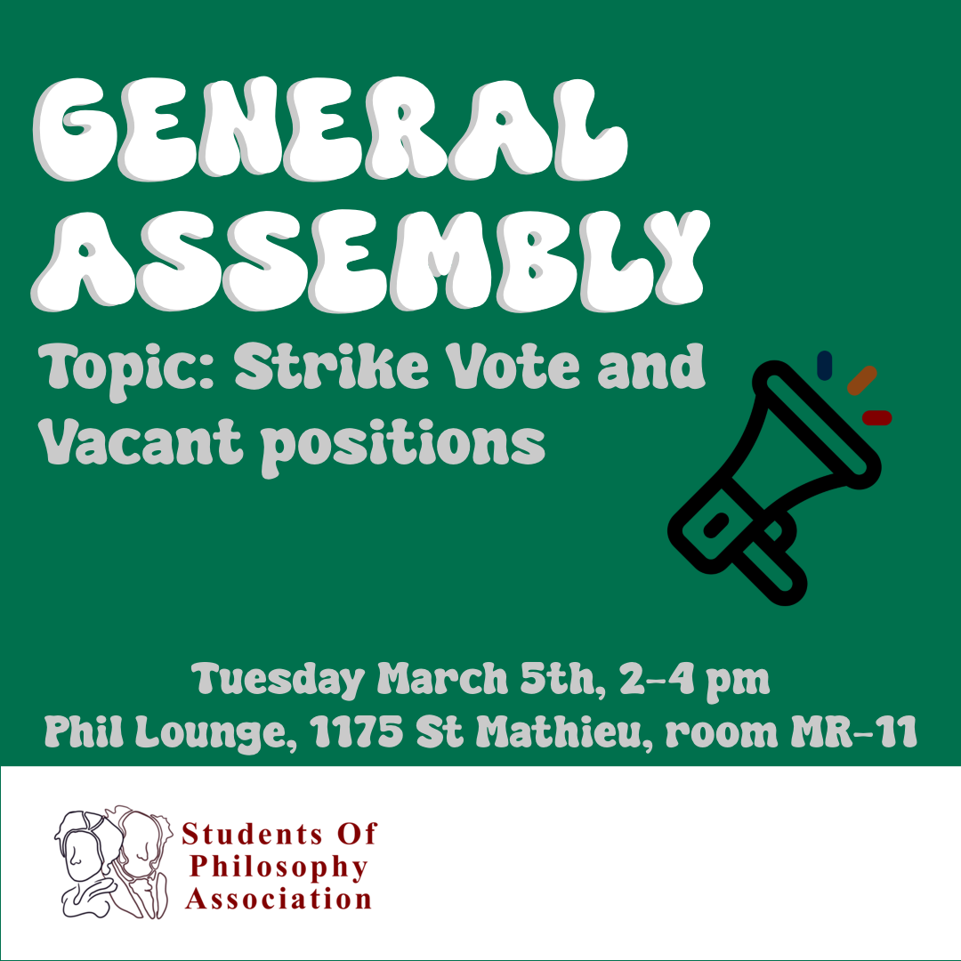Philosophy undergrads, mark your calendars! Join us at Sophia’s General Assembly on Tuesday, March 5th, from 2-4 PM at 1175 St Mathieu. Your input is crucial! 🗳️ We’re diving into the ASFA strike called for March 11-15th and discussing whether Sophia should join. Let’s explore what it means to stand in solidarity and vote on our stance! 💬