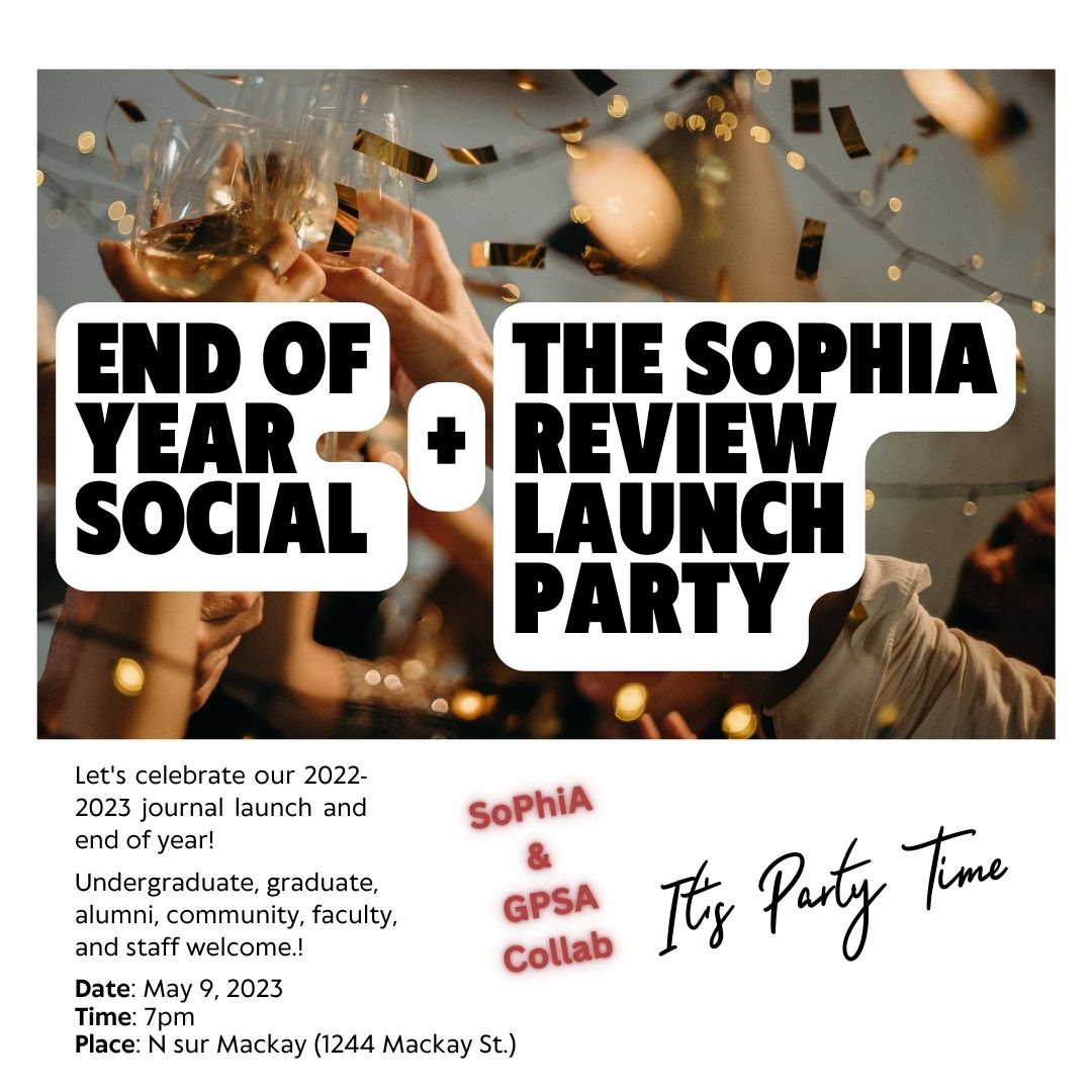This is our 46th issue of the Concordia Philosophy Student Weekly Tabloid, and the final one to be written by your current Outreach and Communications Coordinator. While I may be gone after my three-year stint in SoPhiA, may it continue within the spirit of the new executives in SoPhiA.