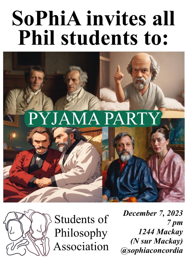 As the semester wraps up, SoPhiA invites all undergraduate and graduate students to join us for a social event on Thursday, December 7th (7 pm), at our classic gathering place, N sur Mackay! This time, thanks to the initiative of Benny, our elected event planner, it’s Pyjama themed. So, grab your favourite PJs and dive into a cozy night filled with great conversations.