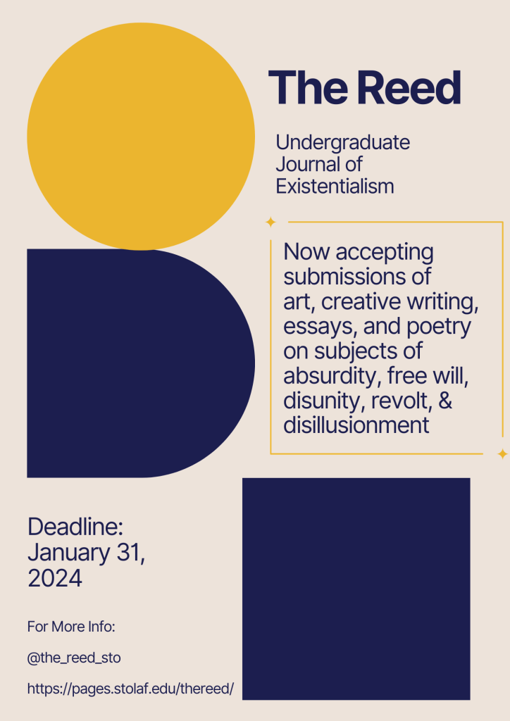 The Reed – St. Olaf College’s Existentialism Journal is calling for submissions! Whether it’s philosophy papers, poetry, short stories, or art exploring the human search for meaning, they want YOUR perspective!